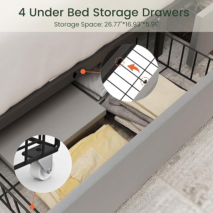 - 【Spacious Storage Drawers】 King size bed with storage drawers offer you a storage solution, allowing you to keep your bedroom tidy and organized; Store extra bedding, blankets, clothing, or personal items in the storage bed, maximizing every inch of available space