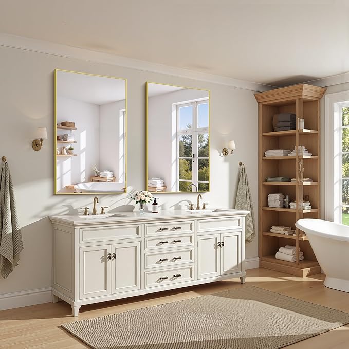 - Modern Design:KOCUUY 30"x48" gold vanity mirror is with innovative design which gives the wall mirror a more fashion feel. With a classic square corner, the wall mounted mirror allows for creativity and functionality in bathroom, bedroom, entryway and anywhere else. Let your living space be an expression of your personal style, not limited to modern or contemporary, farmhouse or industrial