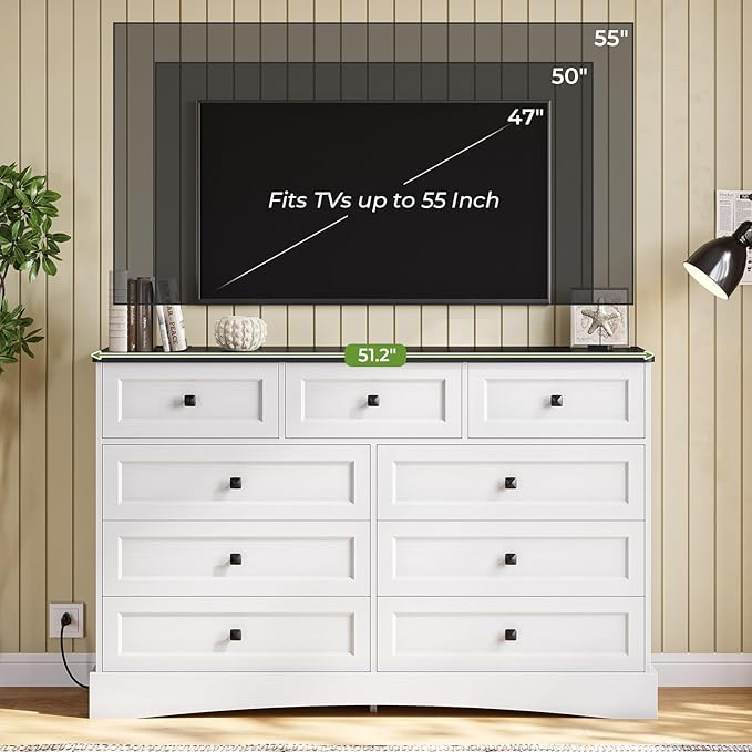 Hasuit Dresser for Bedroom with 9 Drawers, 51.2" Large Dresser with Charging Station, Wide Farmhouse Dresser Chest of Drawers, Wooden Storage Tower Organizer, Dresser for Bedroom Closet, White/Black