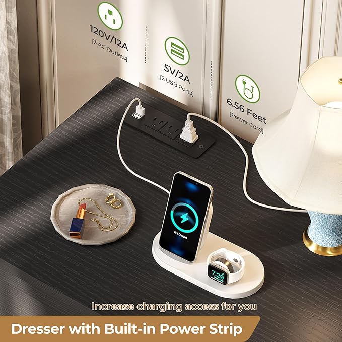 - 【Built-in Power Outlets for Easy Use】This large wooden dresser is equipped with built-in power outlets, including 3 AC outlets and 2 USB ports, which can power your electronic devices such as table lamps, mobile phones, speakers, makeup mirrors, hair dryers, etc. These ports are very convenient to use, especially when your room has limited outlets. It concentrate the wires at the back of the desktop, making it easy to organize, saving space, and keeping the home space beautiful.