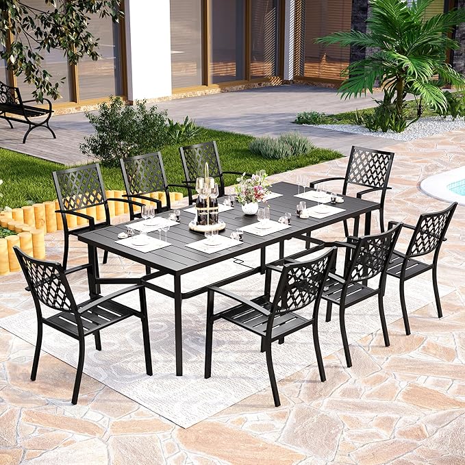 PHI VILLA 9 Pieces Outdoor Dining Set for 8, Rectangular Metal Table with Umbrella Hole & Stackable Wrought Iron Chairs, Large Dining Furniture for Patio, Deck, Yard, Porch
