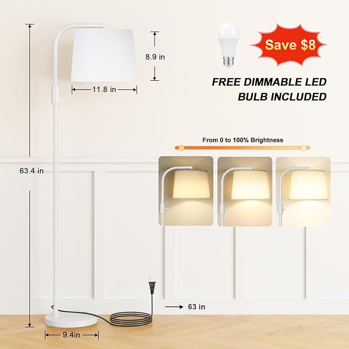 - [9W LED Light Bulb Included] Floors lamp for living room bright lighting comes with E26 base bulb, 3000K(warm white), which can save 90% energy. Lampshade is made of farbic material, it can obstruct the part of lighting from the bulb effectively, which makes the lighting cozy and soft. Whether you want to read, write or simply relax, the standing lamp provides ample illumination without straining the eyes