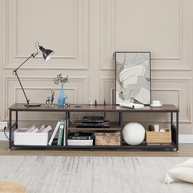 - 【Open Space Design TV Stand】 This TV Stand is degigned of open space, which means no overheating electronics and provides ease of access for cables. We don't need to worry about the device overheating due to being in a confined space. Besides,The different open space sections make for nice storage or an easy space to decorate.