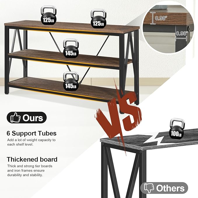 - 3 tier Entryway Console Table: The industrial sofa table is made of sturdy metal frame and chunky wood-grain MDF panels, perfect for displaying lots of things like books, decorative plants and framed photos; it will add a warm atmosphere to your entrance, and you can place the rustic console table with storage for living room as a display table.