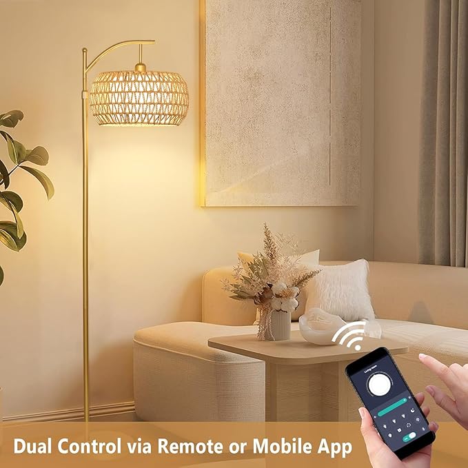 Gold Floor Lamp for Living Room with 3 Color Temperatures,Arc Boho Floor Lamps with Remote Control, Rattan Standing Lamp with Wicker Lamp Shades Dimmable Tall Floor Lamp For Bedroom Living Room Corner