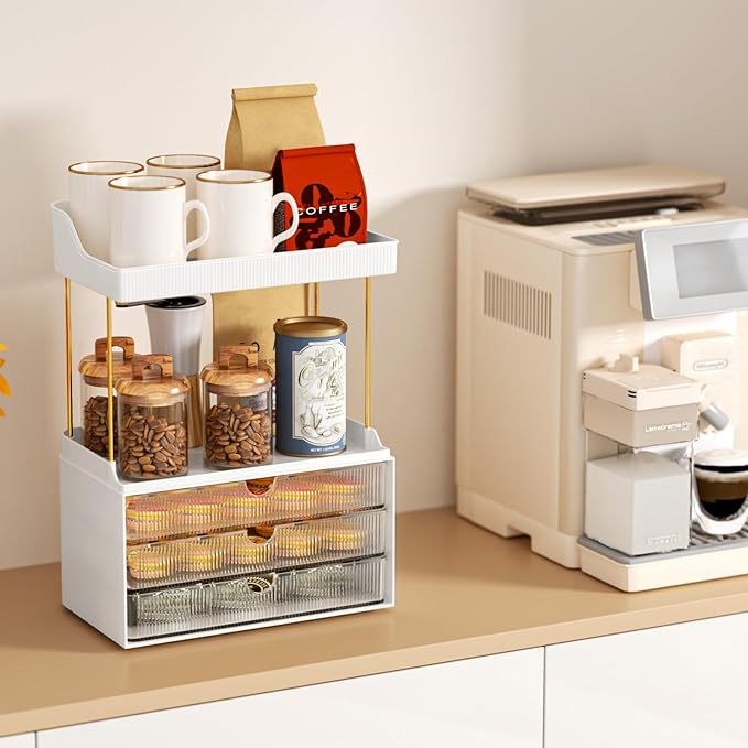 - Ugraded 2-Tier 3-Drawer Bathroom Counter Organizer: Unlike other makeup organizers that only feature 2 drawers, ours offers an enhanced storage capacity. The top two layers can accommodate perfumes, skincare products, and face creams, while the three drawers are perfect for storing eyeshadow palettes, sunscreens, and more.