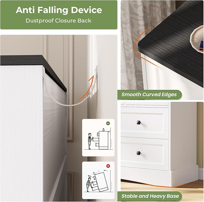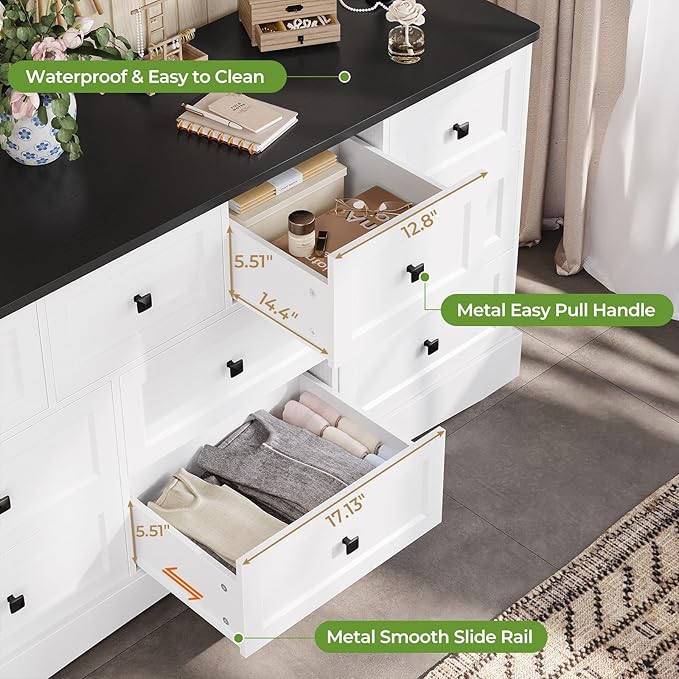 - 【10 Drawers Farmhouse Bedroom Dresser】This white dresser with black desktop for bedroom has 6 spacious large dr awers and 4 small drawers, and two different sizes of drawers can easily classify and organize your items, very suitable for small families to organize and store clothes and toys, blankets or any other personal items. The wide tabletop at the top can serve as an dresser TV stand entertainment center or display your decorations, photo frames, plants, etc. to make your room tidier.