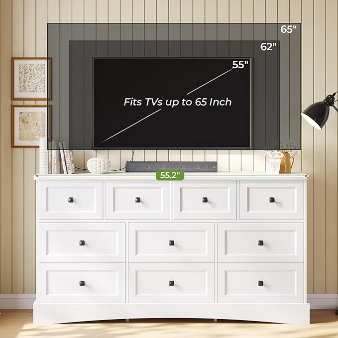Hasuit White Dresser for Bedroom with 10 Drawers, 55.2" Long Drawer Dresser with Charging Station, Farmhouse Dresser Chest of Drawers, Large Wooden Storage Tower Organizer, Dresser for Bedroom Closet