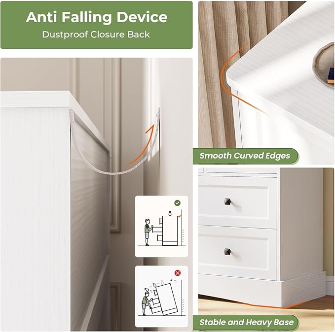 - 【Durable and Stable Large Dresser】Dressers for bedroom is made of high-quality MDF engineered wood. Hard to both flex or crack. Drawers are equipped with high-quality metal slide rails and handles, which are easy to pull and save effort. The thickened back panel ensures the privacy of your storage while enhancing stability. Anti-tip kit included to keep your family safe.The stable base design made the dresser does not slide easily, provide great durability and stability. With support legs in the middle for added weight support.