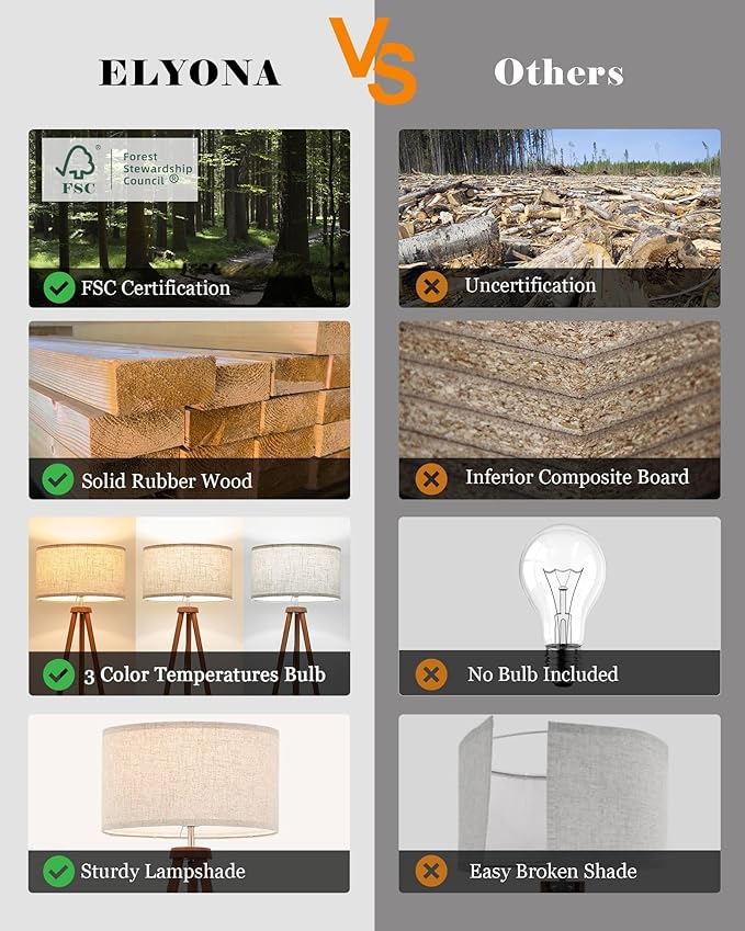 - 【Why can you trust ELYONA's Solid Wood?】① All our wood is sourced from internationally certified legal forests by FSC, ensuring responsible harvesting that does not compromise ecological stabilit. Simultaneously we advocate against any form of illegal logging. ② "Derived from Nature, Returning to Nature" has been the guiding principle we uphold. Showing the beauty of solid wood lamp, and collaborate to lessen the environmental impact of plastics. Let's say "YES" to fostering a greener Earth.