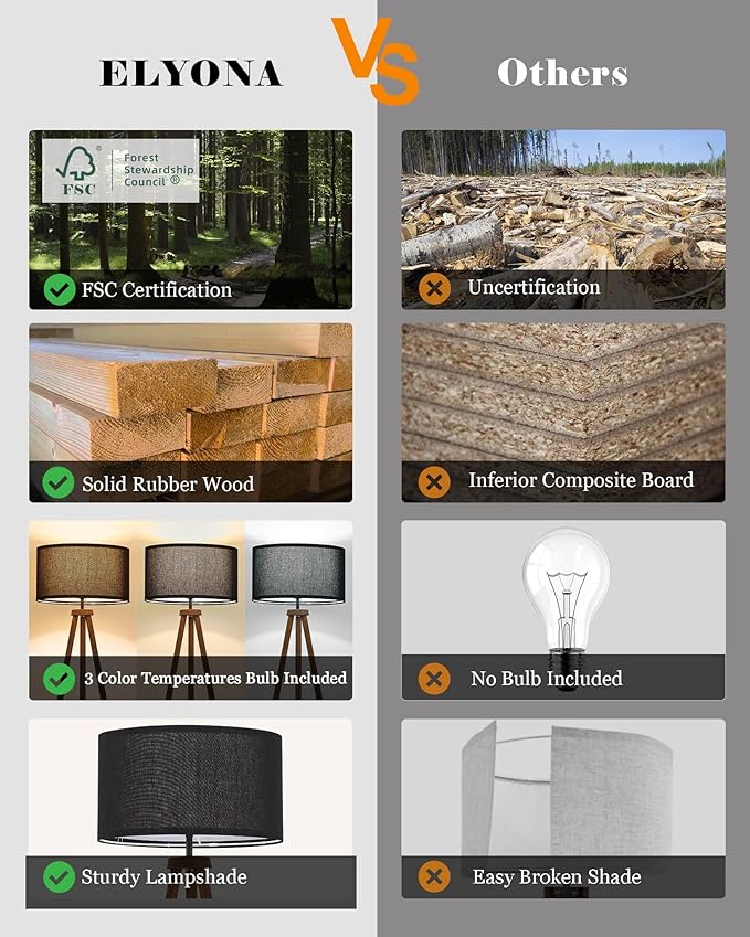 - 【Modern Wood Floor Lamp with Black Drum Linen Shade & Sturdy Tripod Legs 】There is no exactly the same wood grain in the world,each lamp is a unique individual,retain the breath of nature,retain the pure natural wood grain.ELYONA Tripod Floor Lamp is walnut wood color with black metal.The classic triangular design ensures a sturdy structure,making it highly suitable for households with children or pets to prevent accidental collisions that could cause the lamp to topple over.