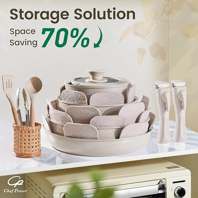 - Easy To Store - Chef Power removable cookware set makes kitchen storage simple, easy to stack and saves 70% space.