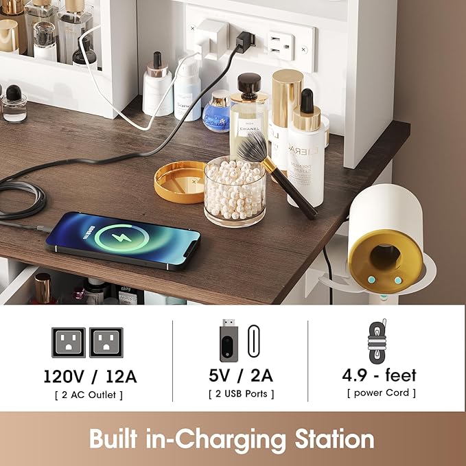 - Charging vanity desk:Combining style and practicality, this vanity with drawers features a built-in charging station with 2 standard outlets and 2 USB ports for a hassle-free solution to charging your electronic devices. Outside hair dryer holder for easy styling and storage