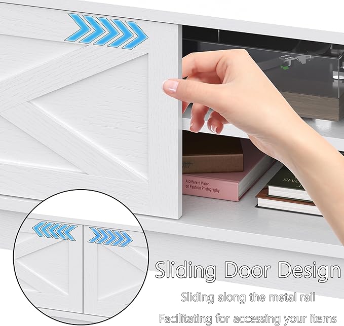 TV Stand for 55/60/65 Inch TV, Farmhouse Entertainment Center with Shelves, Cabinets and Sliding Doors, Rustic TV Media Console Table with Solid Wood Feet & Cord Holes for Living Room, Bedroom, White