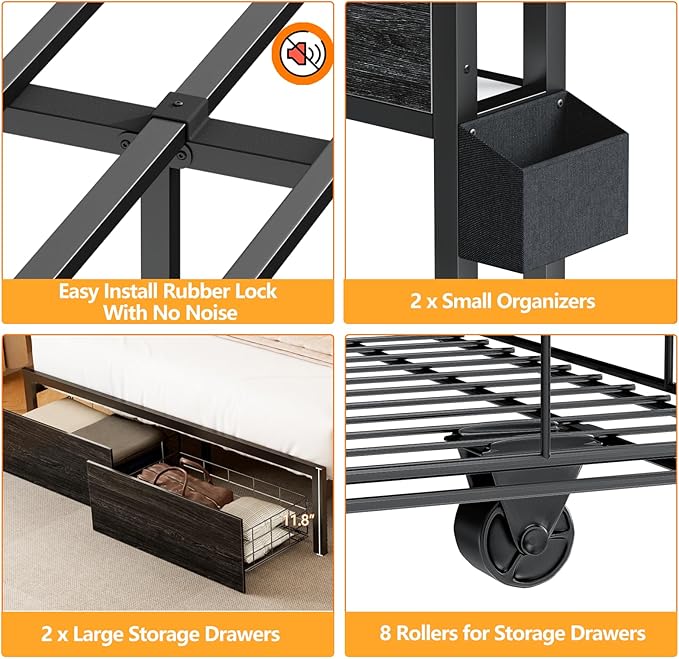 - 【Under-bed Storage Drawers with Pulleys】Equipped with two storage drawers on pulleys, this bed provides an efficient solution for keeping your belongings neatly organized. Store extra bedding, clothing, or seasonal items out of sight yet easily accessible whenever you need them. The pulleys on the drawers allow you to effortlessly pull out drawers and also protects the floor from scratches.