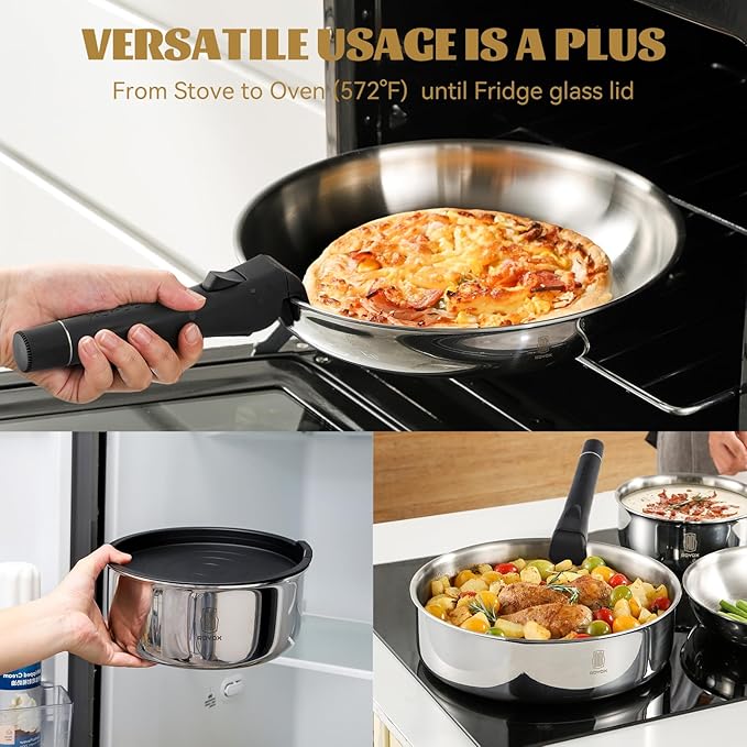 - VERSATILE DESIGN: With a durable stainless steel base, this cookware works seamlessly on all stove types, including induction, gas, electric, halogen, glass, and ceramic. Plus, the two removable handles ensure safe and convenient use without overheating.