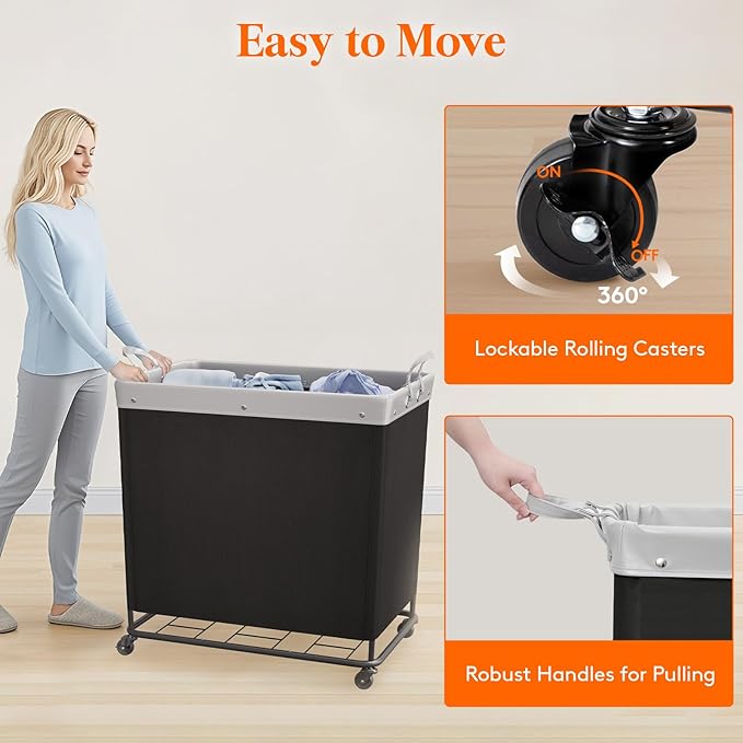 - Effortless Mobility: Equipped with four heavy-duty 2'' rubber wheels and two extra sturdy handles, this laundry hamper with wheels glides smoothly, offering stable and quiet movement; two of the wheels come with brakes, allowing you to lock it in place for added security whenever you need it