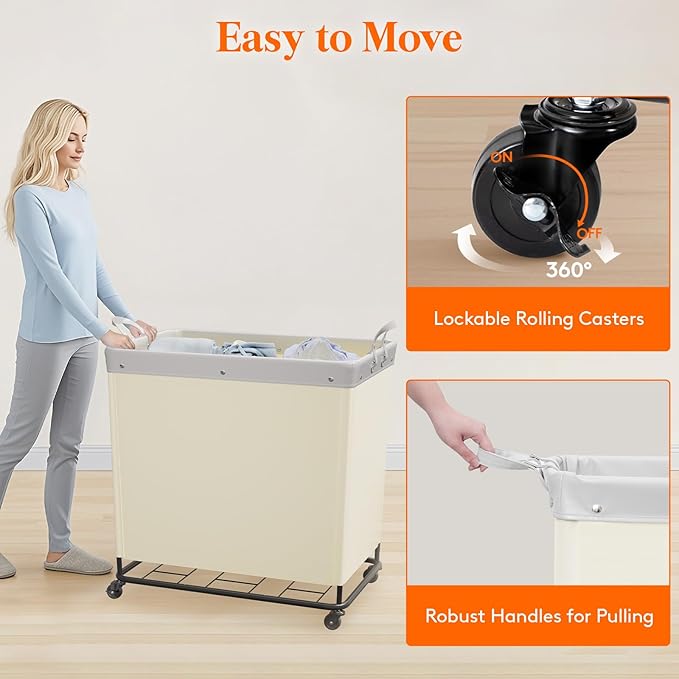 - Effortless Mobility: Equipped with four heavy-duty 2'' rubber wheels and two extra sturdy handles, this laundry hamper with wheels glides smoothly, offering stable and quiet movement; two of the wheels come with brakes, allowing you to lock it in place for added security whenever you need it