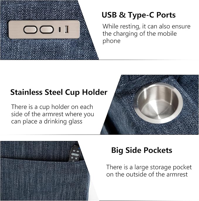 - Win in the Details: You can put your drinks in our 304 stainless steel cup holders, solid and heatproof. Meanwhile, side pockets also provide great convenience for storing books, magazines, or other small things.The USB and Type-C charging ports at the side of the recliner will allow you to charge your mobile devices while enjoying a movie or reading a book. (Notes: The USB and Tape-C ports are ONLY for low-power devices, such as mobile phones and min fans.)