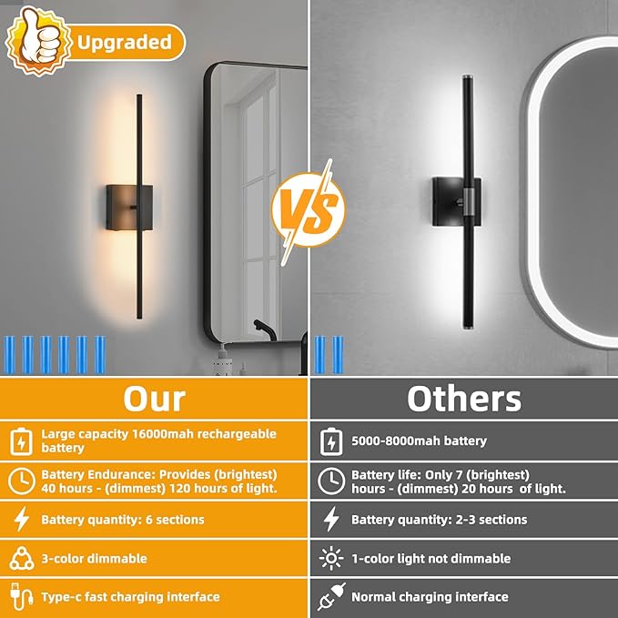- No Wiring Required & Easy to Install: No hardwired mounting, the Wireless Wall Sconce set of 2 only takes a few minutes to install. With a sleek and contemporary design, can rotate 350° to adjustthese sconces effortlessly blend into any indoor space, providing both functionality and style. Effectively illuminates all spaces in your home during a power outage.