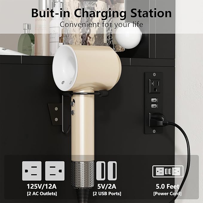 - Vanity Table with Charging Station: This vanity table comes with a charging station and hair dryer holder, including 2 standard plug sockets and 2 USB ports, which can more conveniently connect hair dryers and curling irons, and can also provide power for your mobile phone, tablet or other devices to charge your mobile device, allowing you to take beautiful selfies after applying makeup.