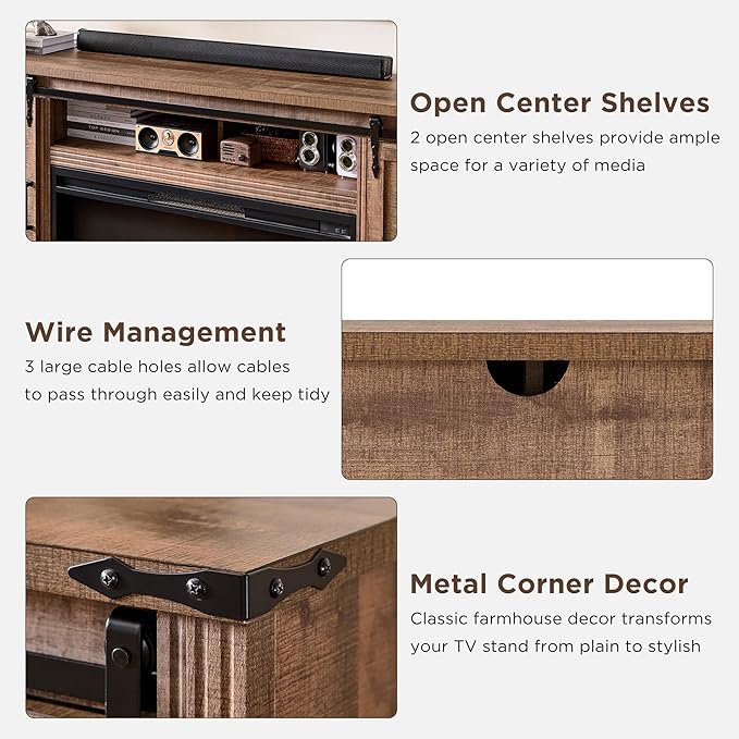 - Farmhouse Fireplace TV Stand: Bring warmth and elegance to your home with this modern farmhouse TV stand, suitable for TVs up to 80". The freestanding design and stylish two-tone finish make this 70" unit a striking centerpiece in any room. Sliding barn doors reveal or conceal the center section, blending comfort with rustic charm to enhance your home’s ambiance.