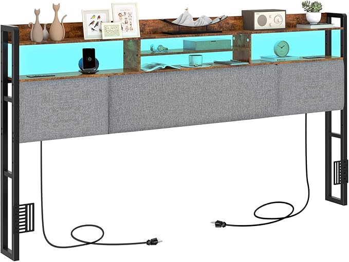 King Size Upholstered Headboard with 2 Outlets and LED Lights, King Bed Headboard with Charging Station & Storage Shelves, King Headboard Only, Height Adjustable, Easy Assembly, Brown