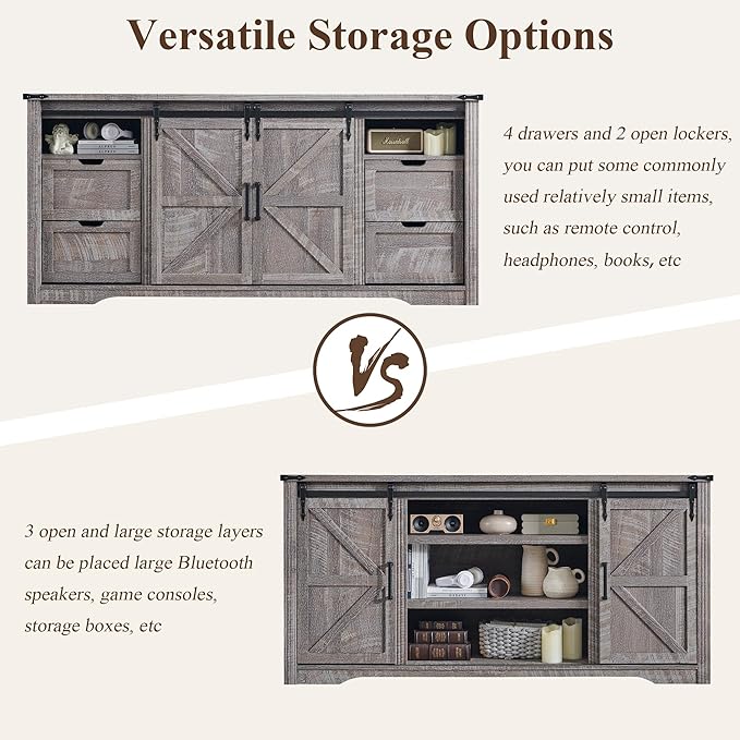 - Farmhouse Style: Our TV console showcases 2 distinctive barn doors, and behind the barn door are four semi-hidden drawers,Imitation wood grain stickers in different colors and styles enrich the character, Elevate your living space with the rustic elegance of our Farmhouse-Style TV Console