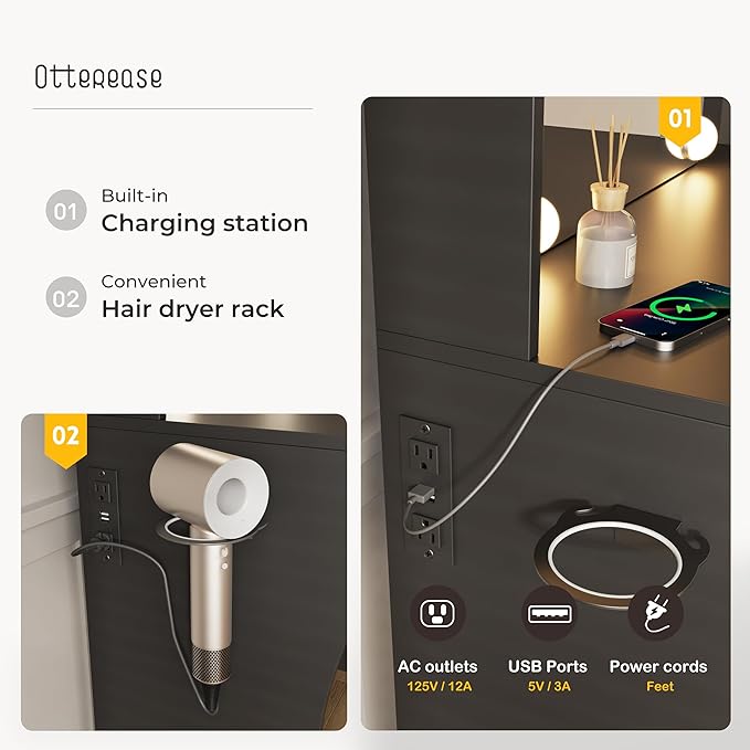 - 【Integrated Convenience Features】The vanity desk has modern conveniences built in to enhance your dressing experience. A charging station allows for easy charging of electronic devices, and a hairdryer holder keeps your styling tools at the ready, promoting a clutter-free countertop.
