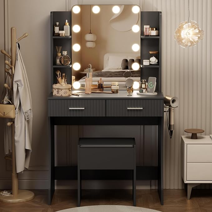Vanity Desk with LED Lighted Mirror, Makeup Vanity with 3 Adjustable Lights, 2 Large Drawers and 4 Open Shelves, Black Vanity with Storage Stool for Bedroom