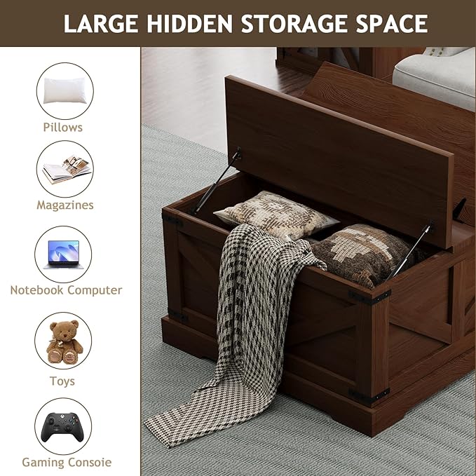 - FARMHOUSE STYLE COFFEE TABLE: The wooden coffee table, specifically designed with a classic farm barn door aesthetic, seamlessly blends modern rustic and vintage farm styles.Practical and stylish, this coffee table with storage not only adds elegance to your farmhouse space but also complements any living room furniture and decor