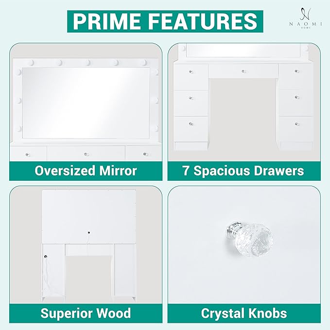 Naomi Home 46" Vera Vanity Set – Makeup Desk with Mirror, 11 LED Lights, Adjustable Brightness & 3 Lighting Modes – Includes Chair and 7 Storage Drawers