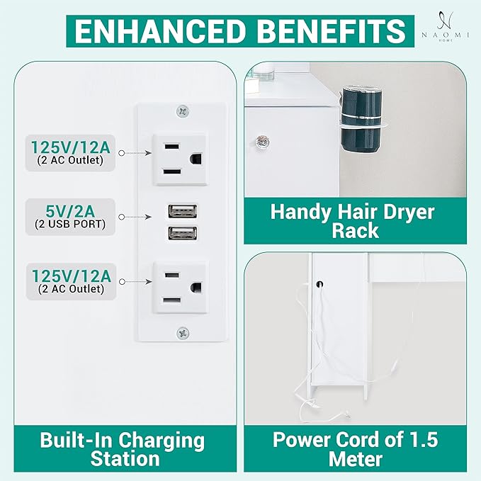 - Built in Charging Station with Outlets and USB Ports- Featuring 2 standard outlets and 2 USB ports, this vanity allows you to power beauty devices and charge your phone all in one convenient location.; Additional Information: The product will be delivered in one carton with the following dimensions.