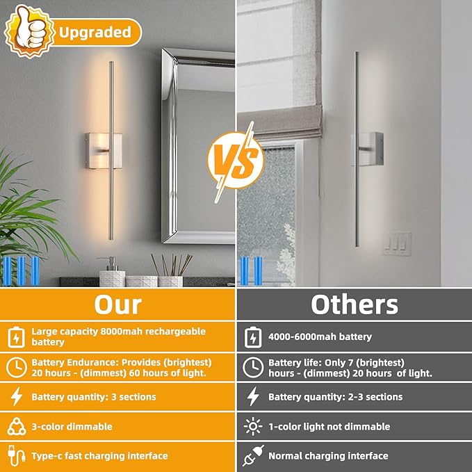 - No Wiring Required & Easy to Install: No hardwired mounting, the Wireless Wall Sconce set of 2 only takes a few minutes to install. With a sleek and contemporary design, can rotate 350° to adjustthese sconces effortlessly blend into any indoor space, providing both functionality and style. Effectively illuminates all spaces in your home during a power outage.