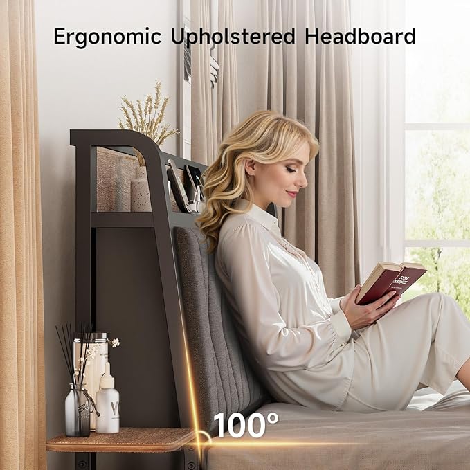 - Special Feature : Ergonomic Upholstered Headboard, Side Storage Shelf, Storage & Charging 2 in 1