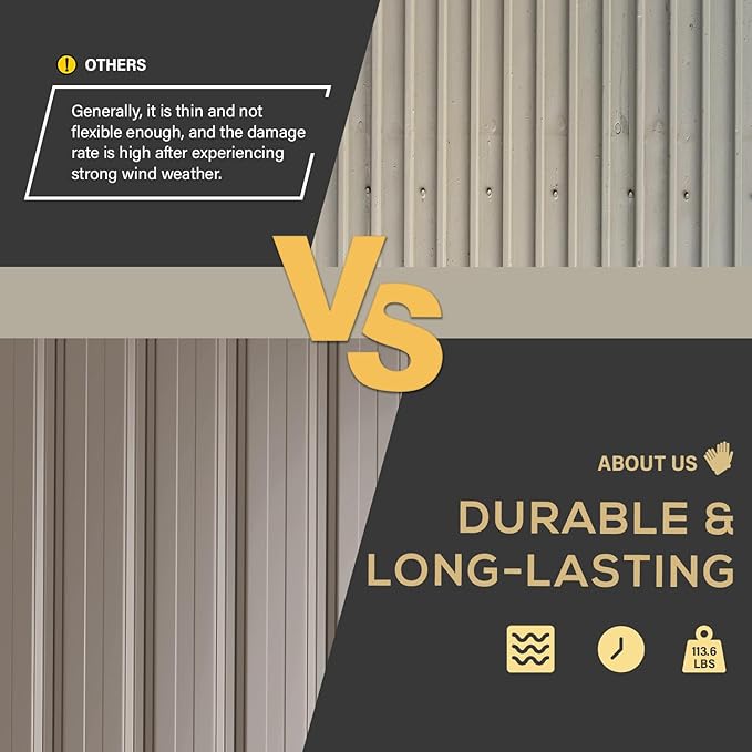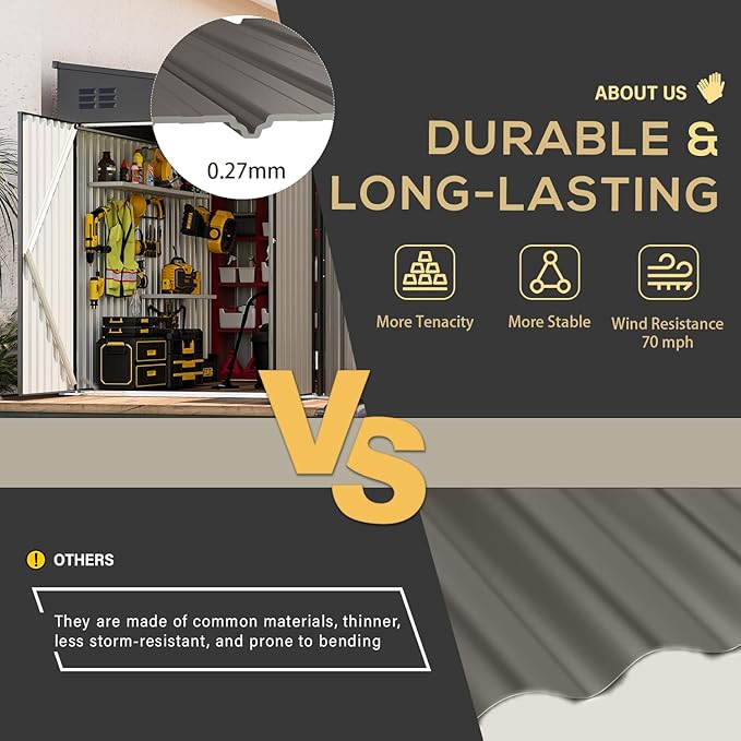 - Robust and Durable: Enhanced metal plates increase the shed's weight to 180 pounds, surpassing cheaper alternatives and significantly reinforcing stability. It withstands severe weather conditions with an impressive wind resistance of approximately 70 mph.