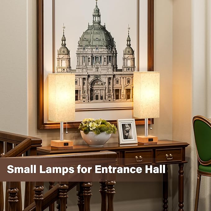 Table Lamp for Bedroom Set of 2 Nightstand - 3 Color Bedside Lamps with AC Outlets for Charging, Square Wooden Night Stand Light Lamp for Living Room, Office Desk