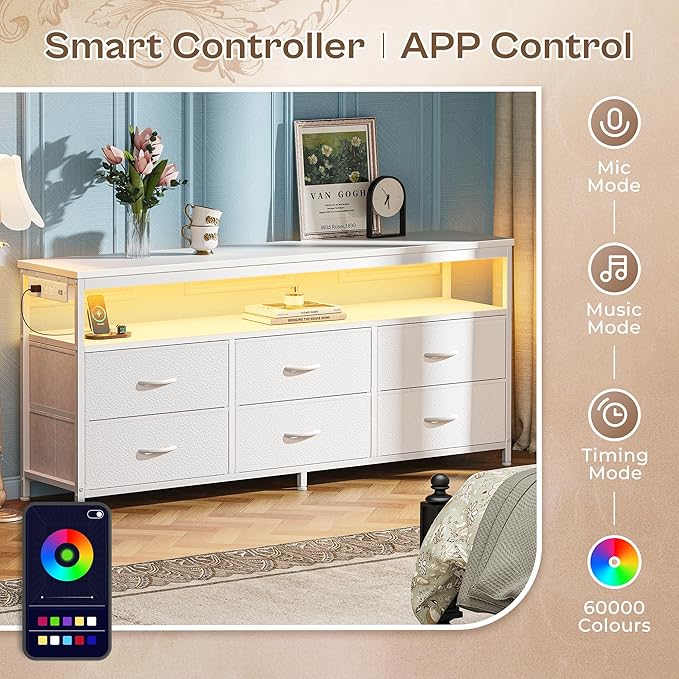 - 【LED TV Stand Dresser】2 ways to control lights - smart controller or app. Choose from over 6,000 colors or adjust the glow to your mood. Set a calming nightlight with the timer for a cozy evening, or try mic mode for interactive color displays during gatherings. Elevate your movie nights or game sessions with a vibrant, personalized light backdrop. Huuger