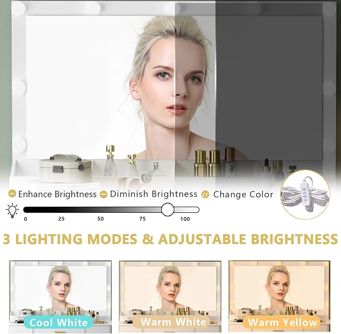 - 【Super Big Mirror with 3 Lighting Modes】The vanity desk is equipped with a super big mirror, measuring 38.31''x17.32''. Surrounding the mirror, there are 9 hollywood bulbs, providing 3 color modes (warm/natural/cool) and brightness adjustable. This vanity desk with mirror and lights can meet all your different needs, perfect for home makeup, salon, and live broadcast. So you can experience the star-like makeup treatment