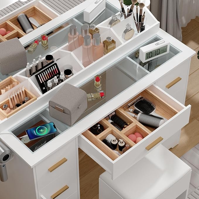 - 【Convenient Charging Station & Visible Tabletop】Equipped with a power strip, this vanity mirror with lights desk includes 2 standard outlets and 2 USB ports, through which you can charge and use electronic devices at the same time. In addition, our makeup vanity desk with lights provides you with a hair dryer rack to keep your hair dryer and hair curler within arm’s reach. The distinctive tempered glass surface provides ample display space and offers a clear view of items stored in the drawer