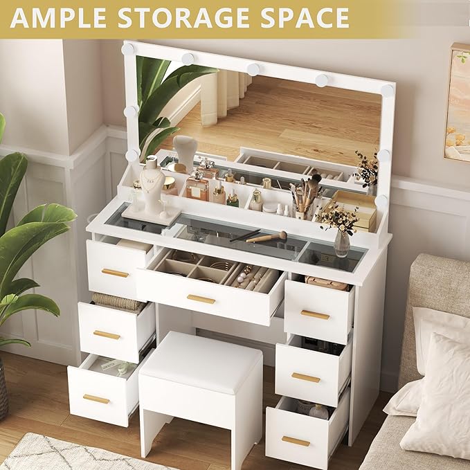 - 【Ample Storage Capacity】The vanity with lights is combined by FOUR parts: 7 sliding drawers in 2 sizes; 4 makeup trays; wide transparent desktop and a cushioned storage stool