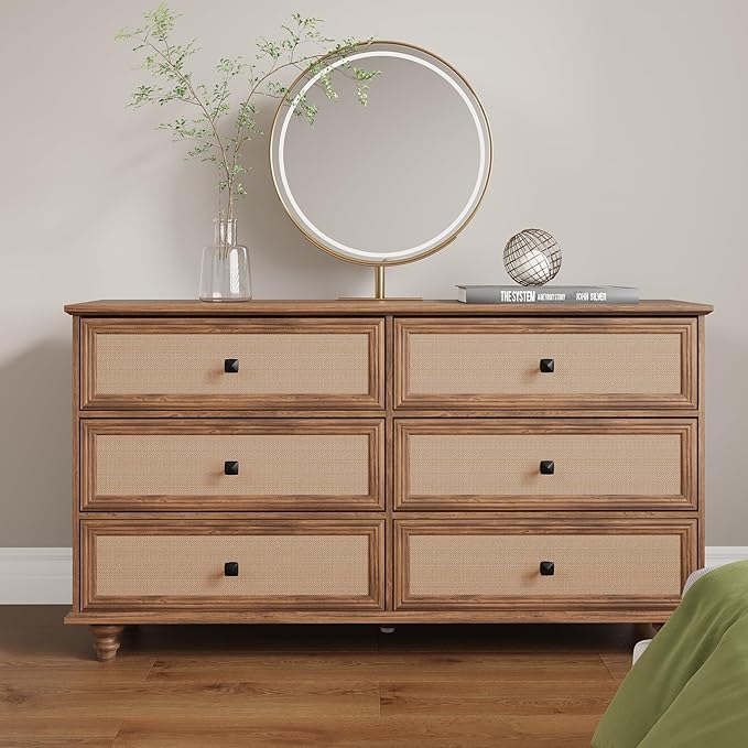6 Drawer Dresser for Bedroom, Mid Century Modern Wide Wood Vintage Chest of Drawers Wooden Storage Organizer Burlap Rattan Drawers for Living Room, Hallway Closet, Entryway, Walnut