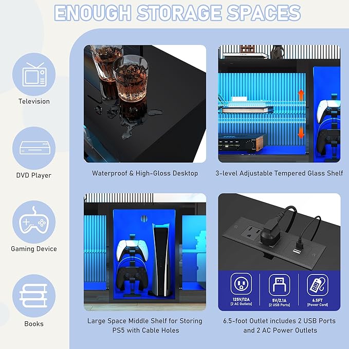 - High Gloss Design:LED gaming entertainment center made of High Gloss P2 grade particle board, scratch-resistant and waterproof, easy to maintain. The High Gloss desktop is flat and smooth with no gaps. Led TV stands desktops have 6.5-foot Power Outlets Including 2 USB and 2 three-hole sockets, enabling you to use your gaming device and TV more effectively. Modern high-gloss and minimalist structures also provide great stability and fashion