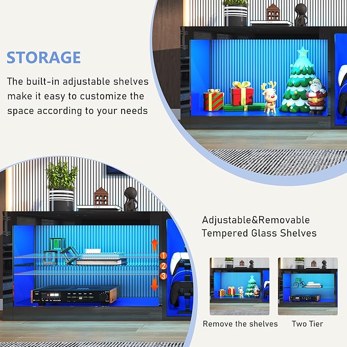 - Wood Television Stand with Storage : the led TV stand has 4 open adjustable glass shelves storage and 1 large middle shelf.The glass shelves are tempered glass. The middle shelves have a hole on the back that can help you organize wires and cables, The glass shelves can be disassembled or adjusted hign according to your need, which is more conducive to the storage for ps5, audio, DVD, routers, game equipment, electronic products, books, magazines, etc., as well as more convenient for cleaning.