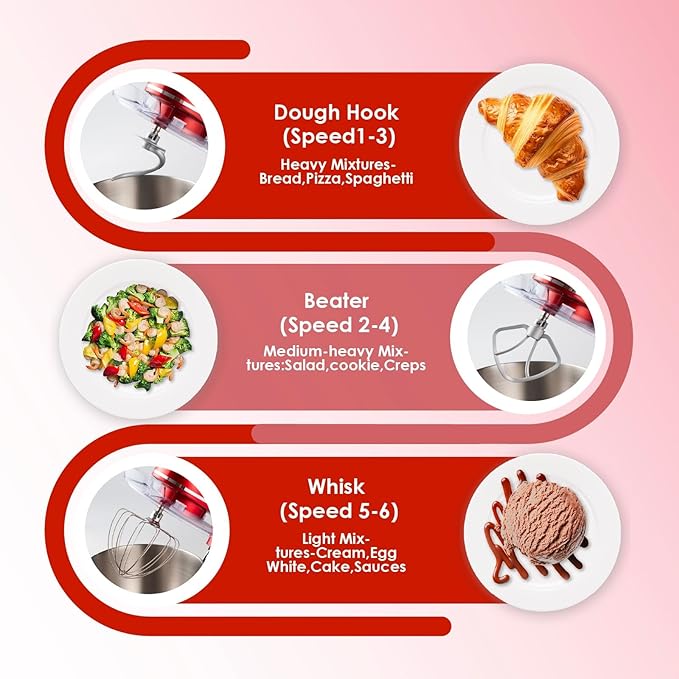 - 6 Speed, Easy to Use: This kitchen mixer features six adjustable speed settings and easy operation to meet your diverse mixing needs. The tilt-head feature allows for effortless switching between bowls and attachments.Its intuitive design ensures ease of use, making it ideal for both beginners and experienced bakers, delivering reliable performance for baking tasks.