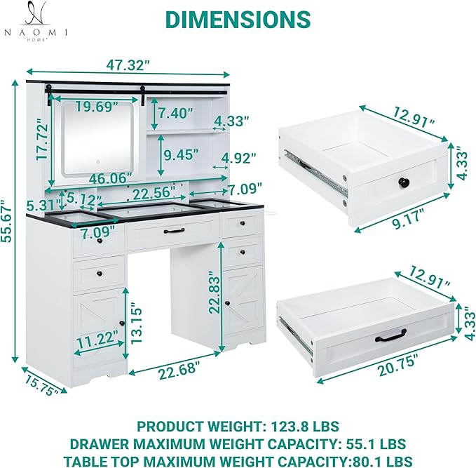- USB and two electrical outlets included. Hair dryer holder in conveniently included on the side panel.; Generous Storage Space With five pull-out drawers, two bottom storage compartments, and a wide tabletop, this vanity offers plenty of room for cosmetics, makeup tools, and jewelry. The sliding mirror adds versatility to your dressing needs.; Overall dimensions 47.32'' L x 55.67'' H x 15.75'' W, providing ample space and storage.