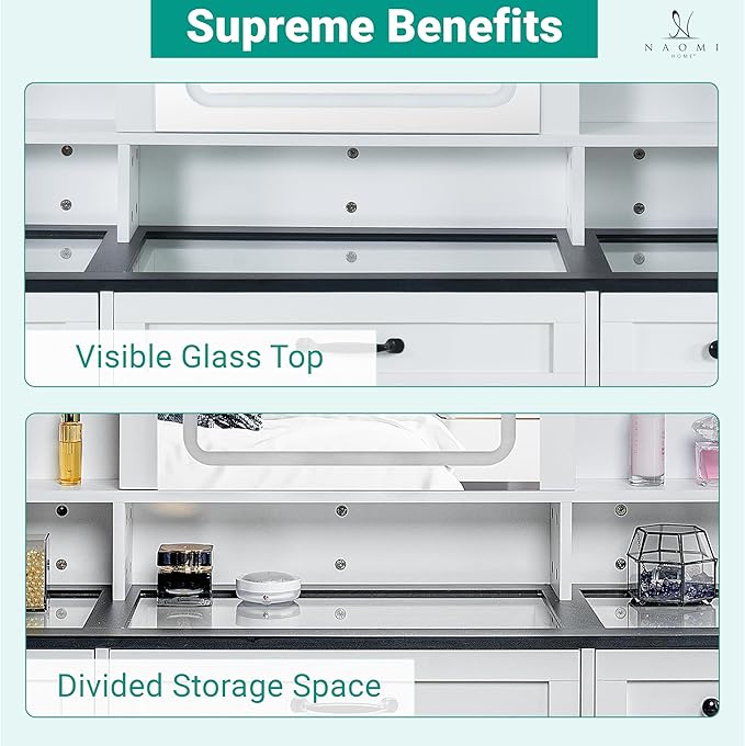 Naomi Home Vanya 47" Makeup Vanity with Sliding Mirror and Lights Farmhouse Vanity Table with 5 Drawers 2 cabinets Visible Glass top and 3 Color Lighting Modes Charging Station with Stool