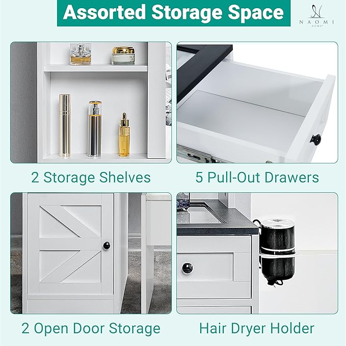 - PLENTY OF STORAGE - keep your everyday beauty essentials and more neatly organized in any of the five pullout drawers, two larger storages with doors, or two shelves behind the sliding mirror.; Farmhouse Vanity Desk Featuring a charming farmhouse style, this vanity desk complements most home decor, adding a touch of elegance to any room. Perfect for use at home, in a salon, or as a studio makeup station, it makes a thoughtful gift for women, daughters, or wives on special occasions.