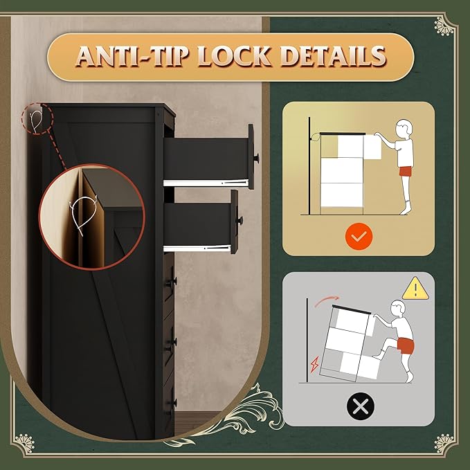 - 🎄【Safe and Sturdy】The tall dresser is crafted from durable engineered wood, ensuring long-term use and scratch resistance. Each wood drawer can hold up to 30lbs, and the wood tabletop can hold up to 88lbs. Equipped with an anti-tipping device, effectively preventing shaking or tipping over, keeping family members and pets safe.