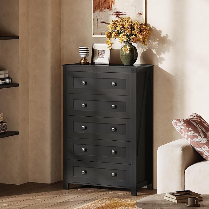 - 🎄【Farmhouse 5 Drawers Dresser】This wooden dresser farmhouse look is heightened by the rustic color finish coupled with the side barn sign and the dark square handle adds a rustic charm. It can be used for bedroom clothing organizer, entryway table, decorative storage for living room.
